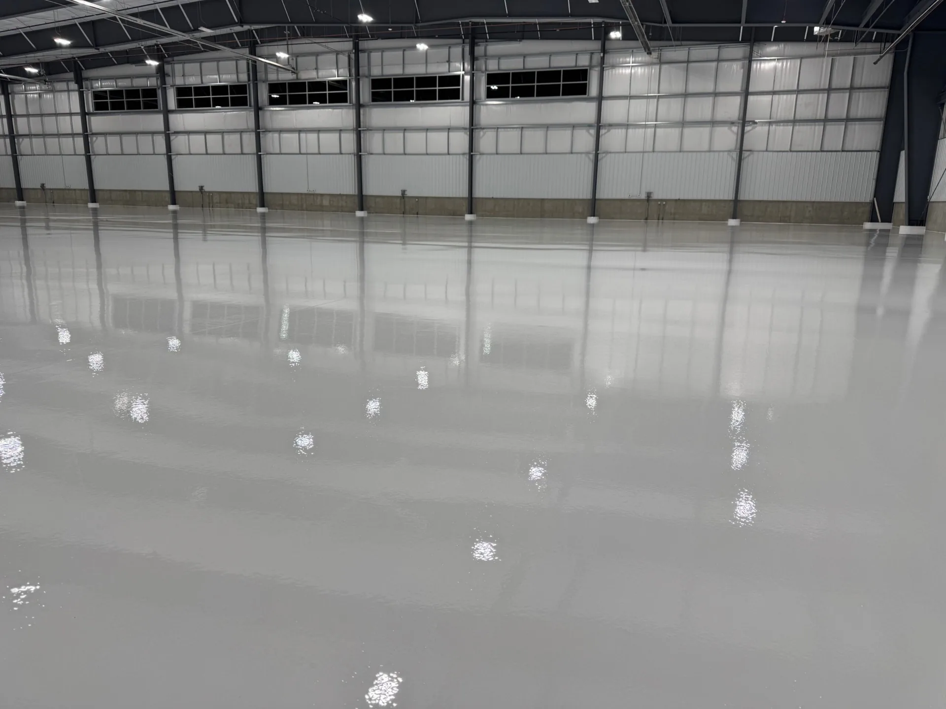 High-performance epoxy floor system installed in an active aircraft maintenance hangar — built for hydraulic fluid, jet fuel, and heavy rolling loads.
